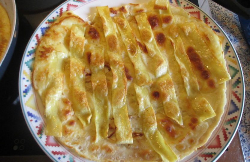 Aus 3 Eiern, 1/4 l. Milch, 5 Esslöffel Dinkelmehl, 1 Teelöffel Backpulver und 1 Prise Salz habe ich einen Teig gerührt und kurz ziehen lassen. In eine Pfanne in etwas heißem Fett eine Kelle Teig gefüllt und mit den Nudelstreifen belegt.