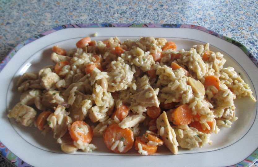 Den fertigen Reis, 3 Esslöffel Frischkäse (0,2%) und 1 Teelöffel TK 8 – Kräuter untergerührt und alles auf einen Teller gefüllt.
