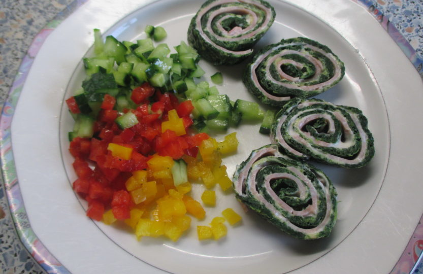 Dann hab ich etwas Leckeres für Euch: Spinatrolle mit Kochschinken und Rohkost.