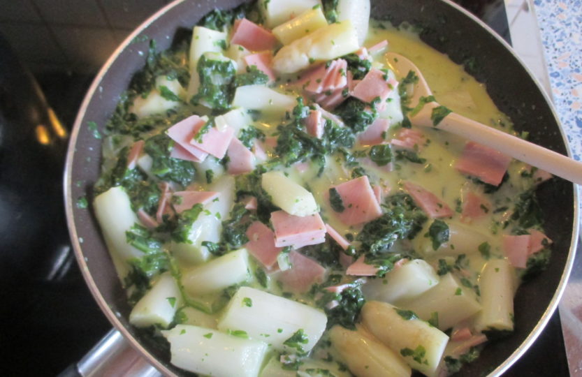 80 gr. Kochschinken habe ich kleingeschnitten und zusammen mit dem Spargel unter die Soße gerührt.