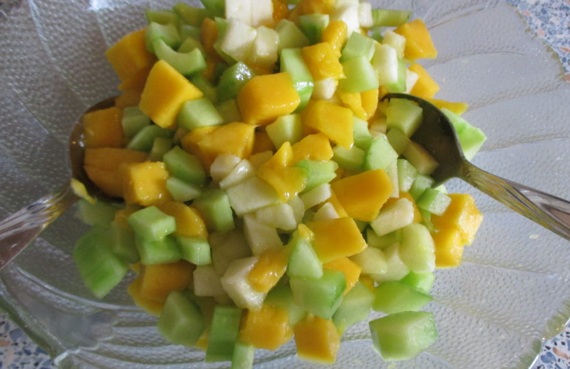 Ich hab Euch doch vor einigen Tagen unseren leckeren Gurken – Melonensalat vorgestellt. Der hat uns so gut geschmeckt und als ich beim Einkauf eine Mango in der Hand hatte, kam mir eine neue Idee: