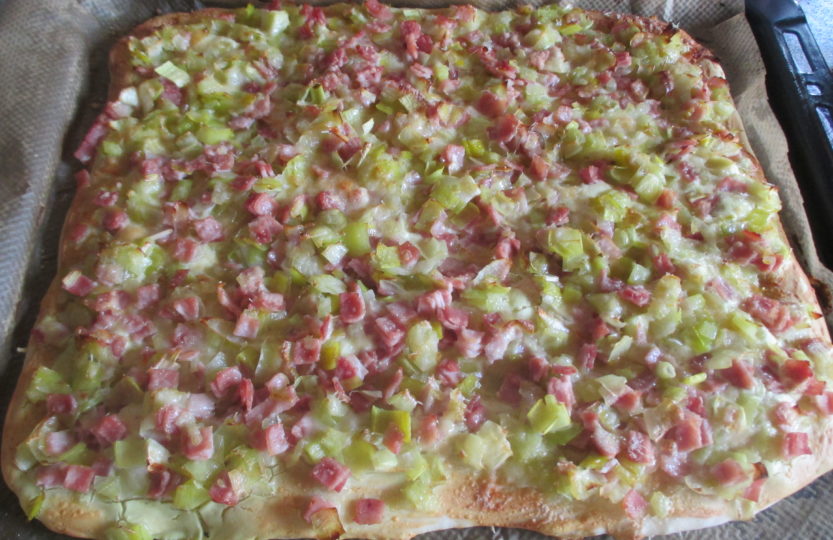 Die noch lauwarme Porree – Schinkenmasse darauf verteilt