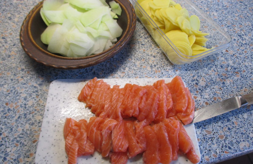 Kohlrabi – Kartoffel – Gratin mit Lachs.
